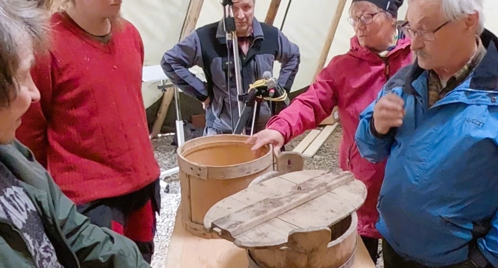 And so, during the spring, a decision was made by the project and the collaborating institutions, Siida and SOGSAKK, would arrange a pilot workshop in the spring related to fish containers and preservation methods. Siida invited Inari Sámi experts and knowledge holders to participate in the workshop. During the session, participants shared memories of how things were done before electricity.