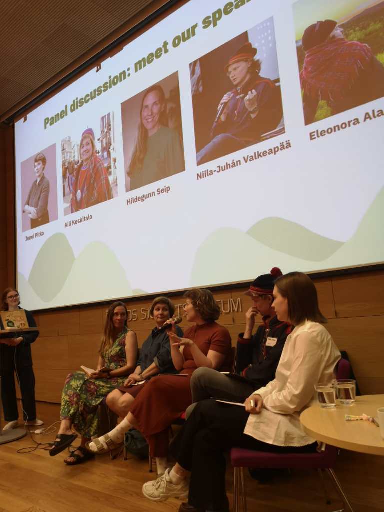A panel discussion followed the presentations, featuring Aili Keskitalo, Political Advisor for Amnesty International Norway, Jenni Pitko, Green Member of Parliament (Finland), Hildegunn Marie Tønnessen Seip, politician from the Norwegian Green Party Niila-Juhán Valkeapää and Eleonora Alariesto.