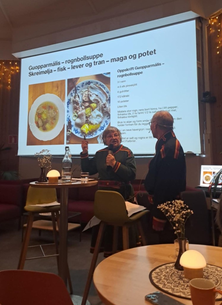 Building on archival knowledge, the Máhtut-project has brought local Sámi food traditions to life by engaging with contemporary Sámi tradition bearers. Ruth and Per Larsen from Skárfvaggi (Skardalen) in Gáivuotna were invited to the museum to share their expertise on guohpparmális (cod roe dumpling soup), a dish that embodies the coastal Sámi’s resourcefulness. The soup combines cod roe, dried meat, potatoes, carrots, and onions, reflecting a holistic use of local resources—fishing, farming, and livestock.